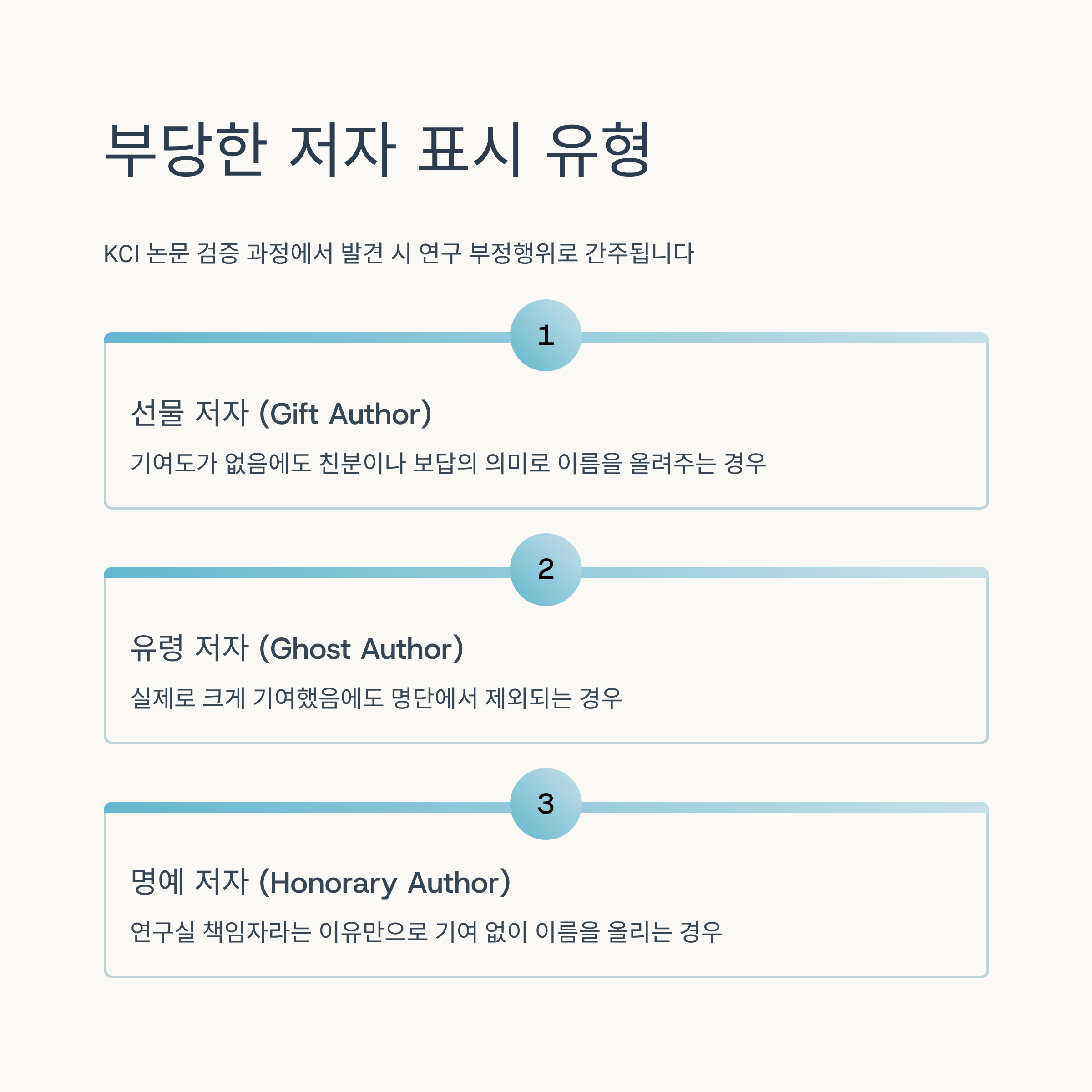 연구 윤리 위반 중 가장 빈번하게 발생하는 것이 부당한 저자 표시입니다. KCI 논문 검증 과정에서 이러한 문제가 발견되면 연구 부정행위로 간주됩니다.