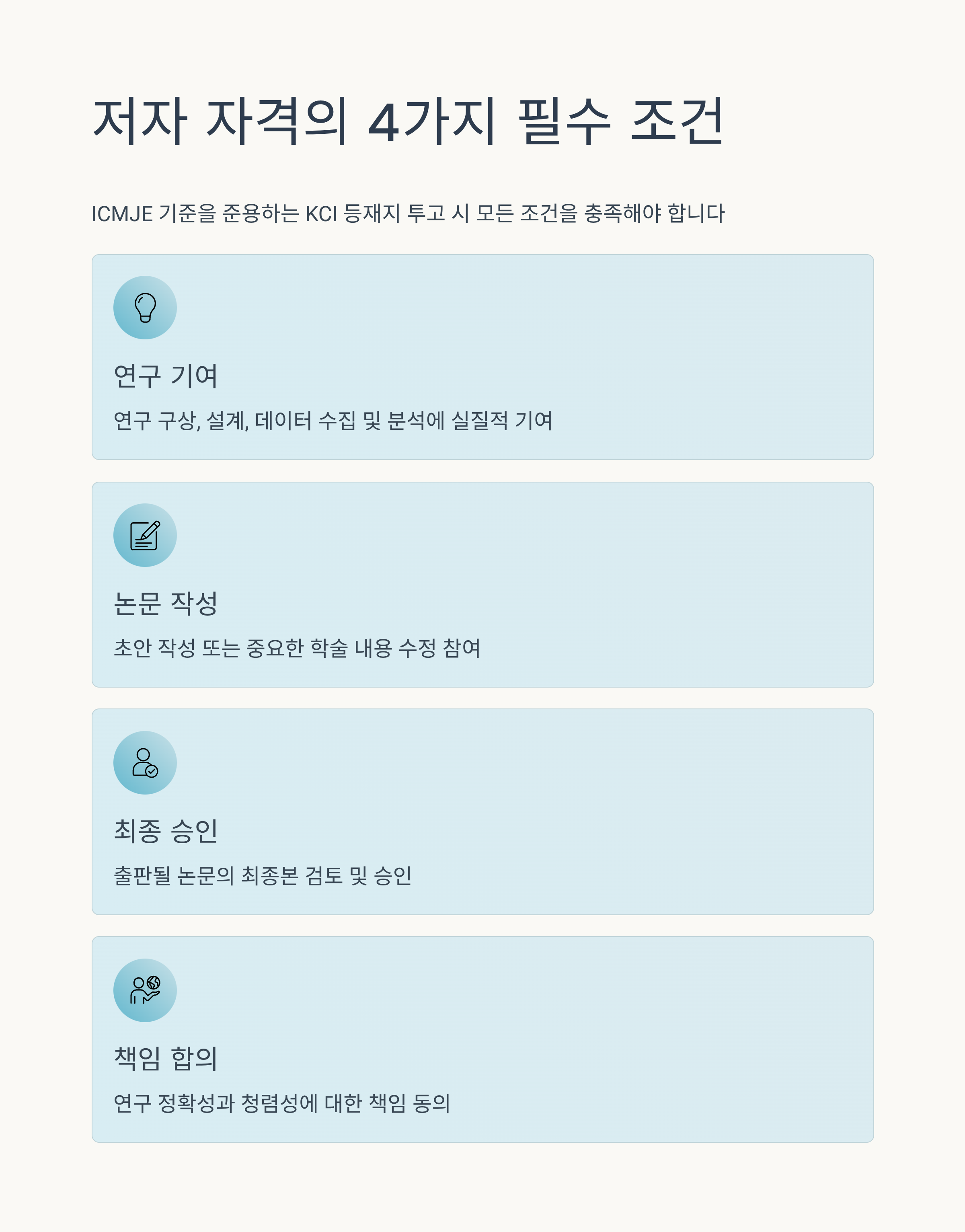 KCI(한국학술지인용색인) 등재지에 논문을 투고할 때는 국제 의학학술지 편집인위원회(ICMJE) 등의 기준을 준용하는 경우가 많습니다. 저자로 등재되기 위해서는 다음 네 가지 조건을 모두 충족해야 합니다.